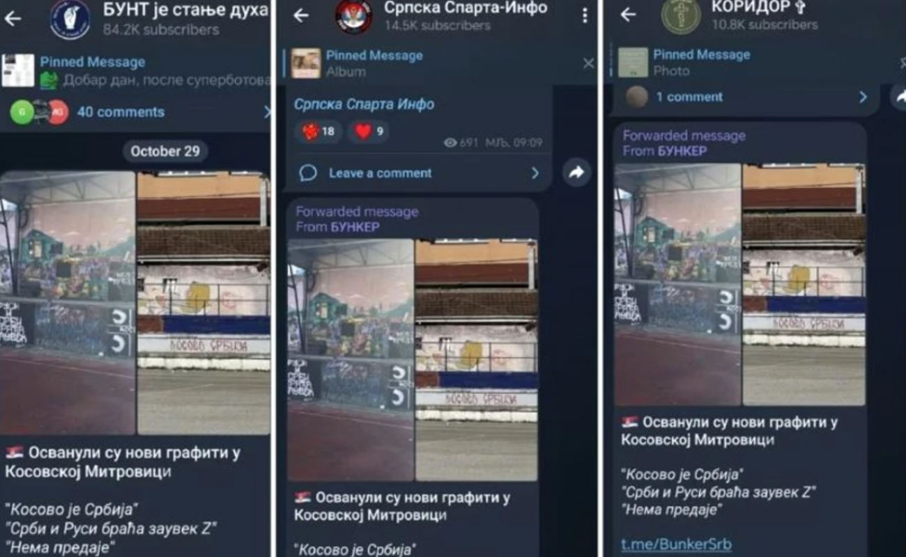 Kështu, më 29 tetor, kanali “Bunker” në Telegram njoftoi se në Mitrovicë të Veriut janë shfaqur grafite të reja: “Kosova është Serbi”, “Serbët dhe rusët janë vëllezër përgjithmonë Z”, “Nuk ka dorëzim”.